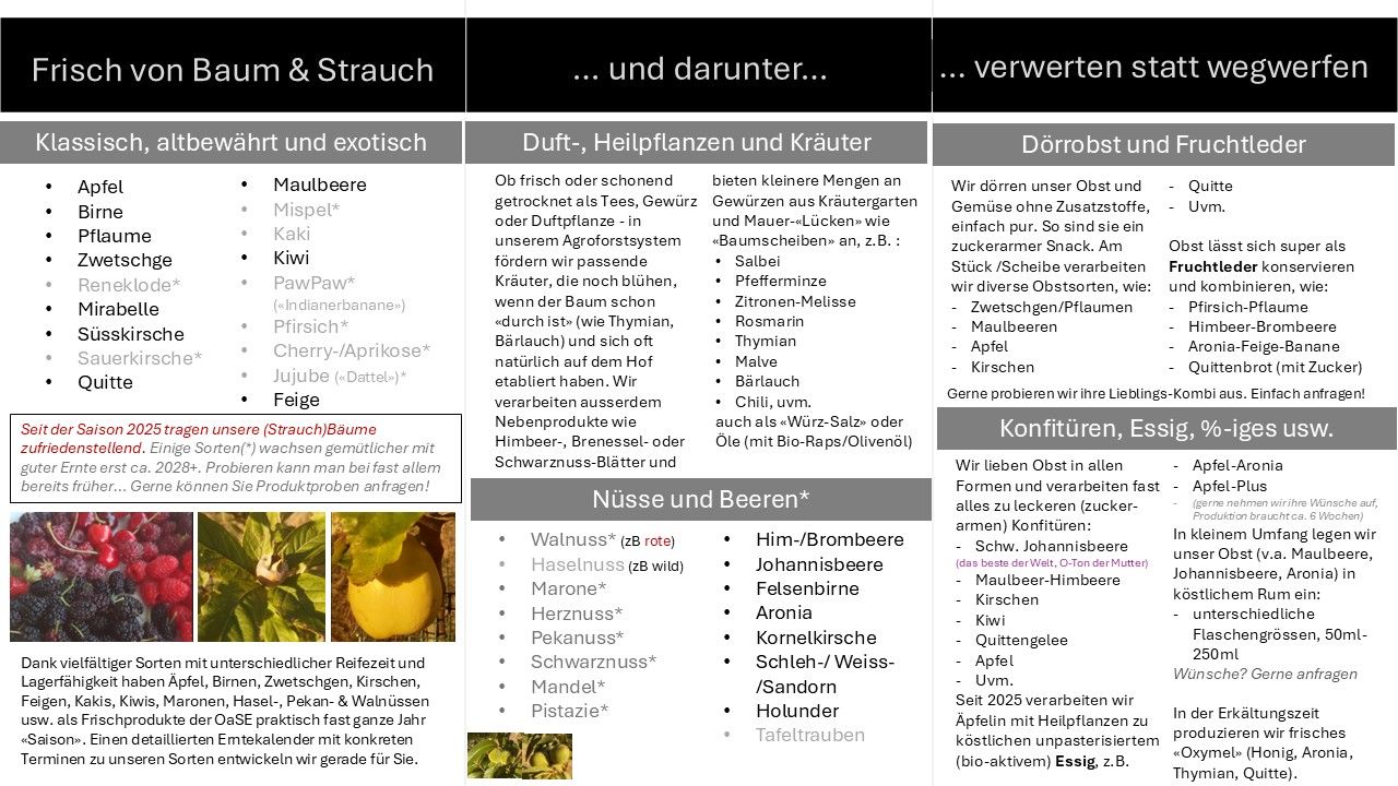 Unsere alte Zabergäu Renette (alte Apfelsorte), Brombeeren und schwarze Johannisbeere (mehr haben die Ziegen nicht stehen lassen) bekommen nun endlich Gesellschaft: Gepflanzt werden diverse Sorten von Apfel, Kirsche, Birne, Pflaume, Quitte, Mispel, Feige, Holunder, Aronia, Heidelbeere, Kiwi, Maulbeere, Schisandra, Kaki, Stachelbeere uvm. Mal sehen was wir noch so setzen werden... dann im Herbst.